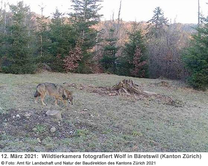 Am Freitag, 12. März 2021, um 18.04 Uhr hat eine automatische Wildtierkamera der lokalen Jagdgesellschaft auf einer Waldlichtung im Raum Bäretswil östlich von Wetzikon einen Wolf fotografiert.