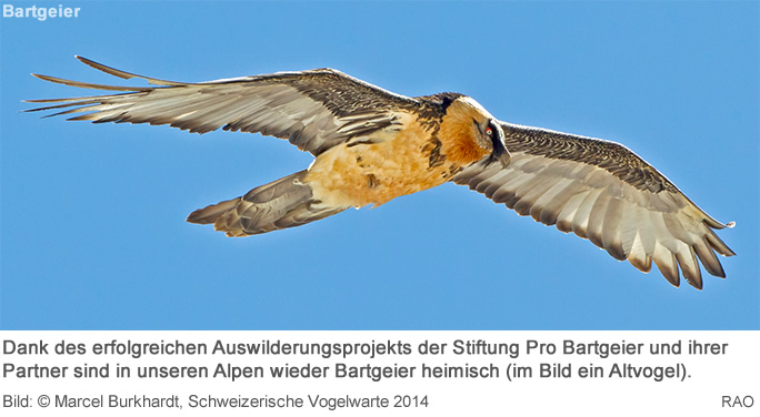 Der Bartgeier wurde Ende des 19. Jahrhunderts im Alpenraum ausgerottet. Dank eines internationalen Wiederansiedlungsprojekts und der Arbeit der Stiftung Pro Bartgeier ist er wieder bei uns heimisch und zieht seit 2007 auch in der Schweiz wieder erfolgreich seine Jungen auf. Die Schweizerische Vogelwarte Sempach unterstützt mit ihren rund 1'800 freiwilligen Mitarbeitenden die Überwachung des Bartgeiers in den Schweizer Alpen und trägt so zum Erfolg des Projektes bei. Im gesamten Alpenraum haben in diesem Jahr rund 30 Paare gebrütet. Davon sind 16 Bruten erfolgreich verlaufen.