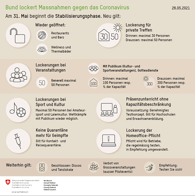 | Am Montag, 31. Mai 2021, erfolgt ein weiterer Öffnungsschritt. Dabei geht der Bundesrat weiter als in der Konsultation vorgeschlagen, insbesondere bei den Veranstaltungen, den privaten Treffen und den Restaurants. Damit reagiert er auf die verbesserte epidemiologische Lage und die Resultate der Konsultation. Zudem sind neu nicht nur Genesene, sondern auch Geimpfte von der Quarantäne ausgenommen. An seiner Sitzung vom 26. Mai 2021 hat der Bundesrat auch entschieden, wann und mit welchen Vorgaben Grossveranstaltungen wieder stattfinden können und wie sie entschädigt werden, wenn sie aus epidemiologischen Gründen abgesagt werden müssen. |
