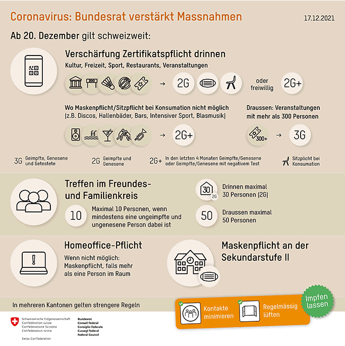 | Ab Montag, 20. Dezember 2021, gelten in der Schweiz verschärfte Massnahmen gegen die Ausbreitung des Coronavirus. Zu Innenräumen von Restaurants, von Kultur-, Sport- und Freizeitbetrieben sowie zu Veranstaltungen im Innern haben nur noch geimpfte und genesene Personen Zugang (2G). Damit wird das Risiko reduziert, dass nicht immunisierte Personen infiziert werden. Sie geben das Virus leichter weiter und erkranken viel häufiger schwer. Als zusätzlicher Schutz muss an diesen Orten eine Maske getragen und es darf nur im Sitzen gegessen und getrunken werden. Wo die Maske nicht getragen werden kann, wie bei Blasmusikproben, oder wo nicht im Sitzen konsumiert werden kann, wie in Discos und Bars, sind nur noch geimpfte und genesene Personen zugelassen, die zusätzlich ein negatives Testresultat vorweisen können (2G+). Personen, deren Impfung, Auffrischimpfung oder Genesung nicht länger als vier Monate zurückliegt, sind von dieser Testpflicht ausgenommen. Ausserdem gilt erneut eine Homeoffice-Pflicht. Private Treffen sind auf zehn Personen beschränkt, falls eine Person ab 16 Jahren dabei ist, die nicht geimpft oder genesen ist. Dies hat der Bundesrat an seiner Sitzung vom 17. Dezember 2021 entschieden. Der Bundesrat hat zudem die Übernahme der Testkosten geregelt und die Beschaffung zusätzlicher Impfdosen beschlossen. |