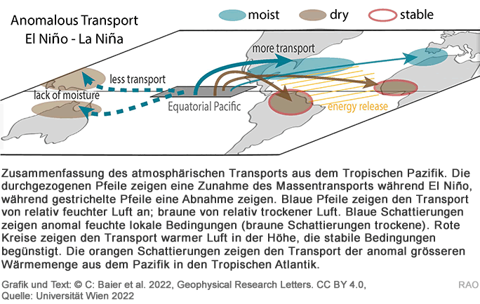 Die Mechanismen hinter diesen Telekonnektionen waren bisher - trotz zahlreicher Forschungsarbeiten über ENSO - noch nicht ausreichend geklärt. Am Institut für Meteorologie und Geophysik der Universität Wien gelang nun ein Durchbruch im Verständnis der Rolle des Luftmassentransports bei Telekonnektionen: Ein Forschungsteam konnte zeigen, dass Schwankungen des Transports von Luftmassen, Wärme, Feuchtigkeit und Energie aus dem tropischen Pazifik für viele der beobachteten Klimaanomalien kausal verantwortlich sind.