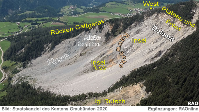 Der beweglichste Teil des grossen Erdrutschkomplexes wird die "Insel" genannt. Er befindet sich an der Spitze einer grossen vegetationslosen "Narbe", die durch frühere Massenabgänge im Hang entstanden ist. Die "Insel"-Masse bewegt sich seit Jahren mit zunehmender Geschwindigkeit abwärts: von einigen Metern pro Jahr in der Mitte der 2010er Jahre bis zu über 40 Metern pro Jahr Anfang Mai 2023.