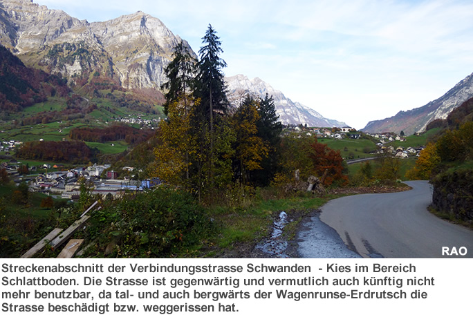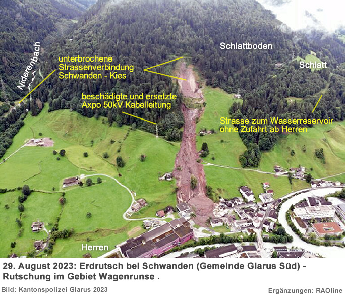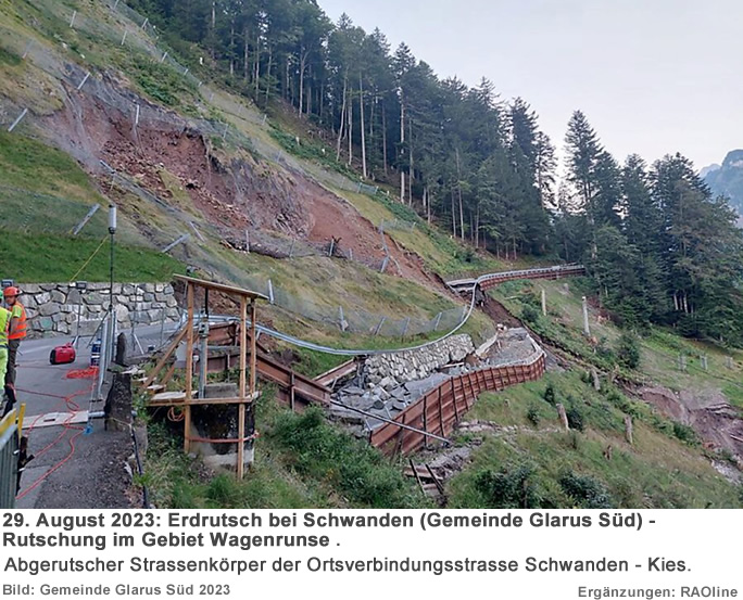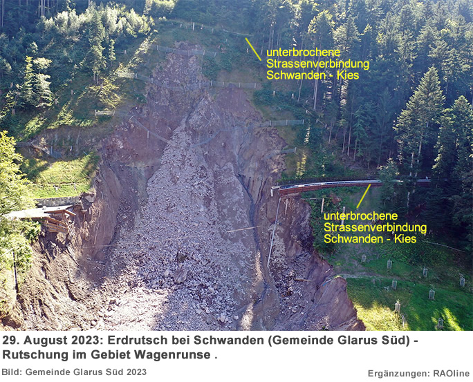 21. August 2023 bis 29. August 2023 21.08.2023, 9.45 Uhr Grosse Rutschung im Gebiet Wagenrunse fordert Evakuierungen und Sofortmassnahmen In der Nacht vom 20. August 2023 ereignete sich eine unerwartete Rutschung oberhalb und unterhalb der Niderentalstrasse ob Schwanden mit massiven Infrastrukturschäden. Dies ist bereits die dritte Rutschung in diesem Jahr. Als Sofortmassnahme wurden 5 Haushalte und 2 Gewerbebetriebe im gefährdetsten Bereich evakuiert. Im Einsatz waren 30 Personen, inkl. Feuerwehr, Naturgefahrenkommission, Gemeindeführungsorganisation (GFO) und Polizei. Das betroffene Gebiet ist gesperrt, Fachspezialisten führen vor Ort Beurteilung und Messungen durch. Dies ist die bisher grösste Rutschung mit massiven Infrastrukturschäden. Die Gemeinde arbeitet intensiv an einer Stabilisierung. Auf den Tourismus hat dieses Ereignis keinen Einfluss: Das beliebte Wandergebiet Kies-Mettmen ist bereits seit dem Frühjahr mit guten Busverbindungen über eine Alternativ-Route erschlossen.