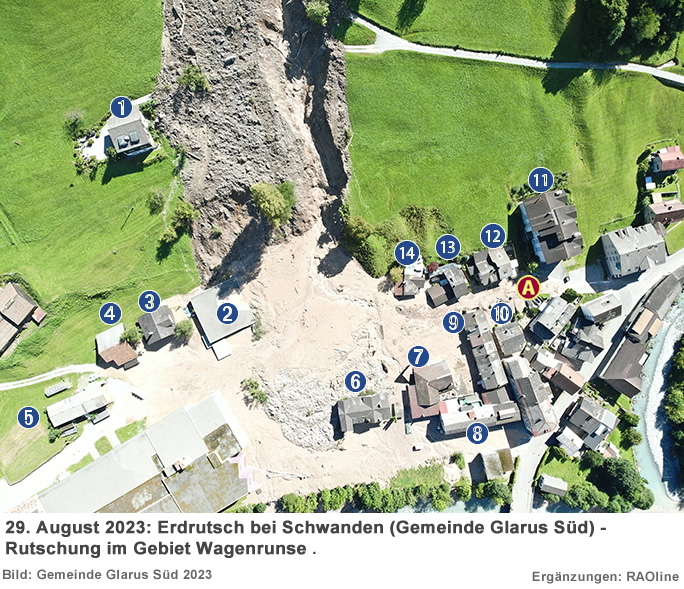 30.08.2023,14.00 Uhr Erdrutsch in Schwanden Nach Schätzungen sind rund 30'000 Kubikmeter Material abgerutscht. Es liegen noch weitere 60'000 bis 90'000 Kubikmeter im Hang oben. Angaben über das Ausmass von Sachschäden sind zurzeit noch nicht möglich; nach ersten Erkenntnissen sind 38 Liegenschaften verschü̈ttet oder zerstört - das Ausmass dehnt sich laufend aus. Das evakuierte Gebiet betrifft rund 100 Personen. Sie sind temporär untergebracht. Die Gemeinde sucht derzeit in Zusammenarbeit mit Glarnerland Tourismus nach Unterkü̈nften fü̈r mehrere Tage. «Unsere Einsatzkräfte sind rund um die Uhr gefordert. Leider mussten wir aus Sicherheitsgrü̈nden vielen Personen den Zutritt zu ihrem Heim auf unbestimmte Zeit entziehen», bedauert Gemeindepräsident Hans Rudolf Forrer. Und er ergänzt: «Was es im Einzelfall bedeutet, ist für Aussenstehende kaum nachvollziehbar. Doch dank den rechtzeitigen Evakuationen, kam es bisher zu keinem Personenschaden.»