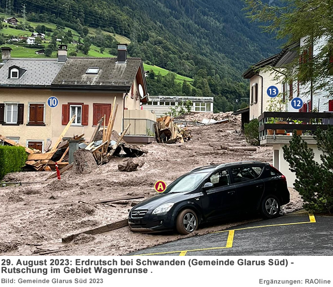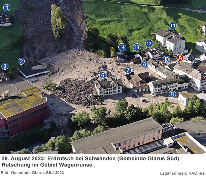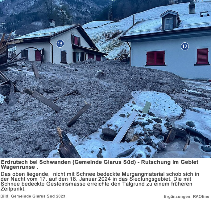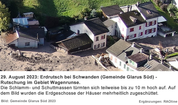 29.08.2023, 20.00 Uhr Erdrutsch in Schwanden Am Dienstag, 29. August 2023, ca. 17.05 Uhr, kam es bei der Wagenrunse oberhalb Schwanden GL zu einem Erdrutsch, der sich auf einer Länge von über 400 Metern erstreckte. Die Erdmassen zogen diverse Gebäude in Mitleidenschaft. Weitere Erdmassen schoben sich um ca. 19.30 Uhr nach. Gemäss bisherigem Informationsstand gab es keine Verletzten. Angaben über das Ausmass von Sachschäden sind zurzeit noch nicht möglich; nach ersten Erkenntnissen sind gut ein halbes Dutzend Häuser verschüttet oder zerstört. Der Gemeindeführungsstab der Gemeinde Glarus Süd führt die Evakuierungen im grösseren Einzugsgebiet des Erdrutsches durch. Im Einsatz stehen Kräfte der Feuerwehr Glarus Süd sowie der Feuerwehr Glarus, des Rettungsdienstes, des Zivilschutzes und der Kantonspolizei Glarus.