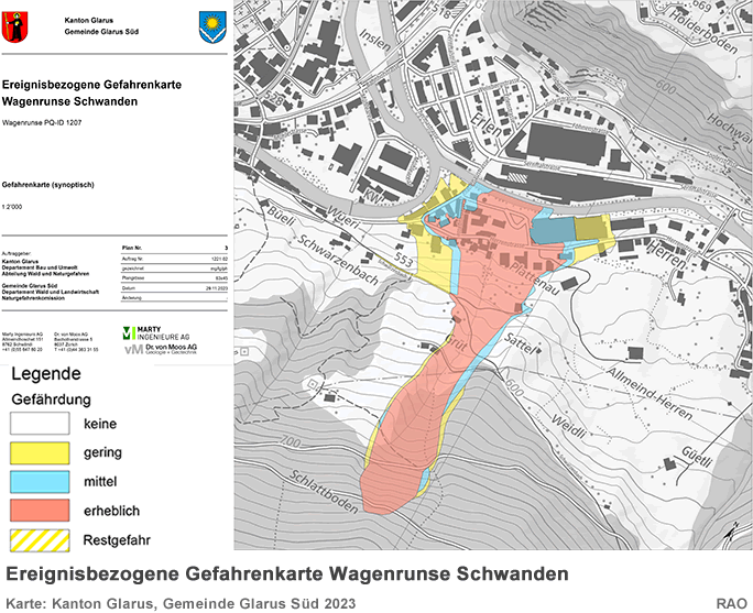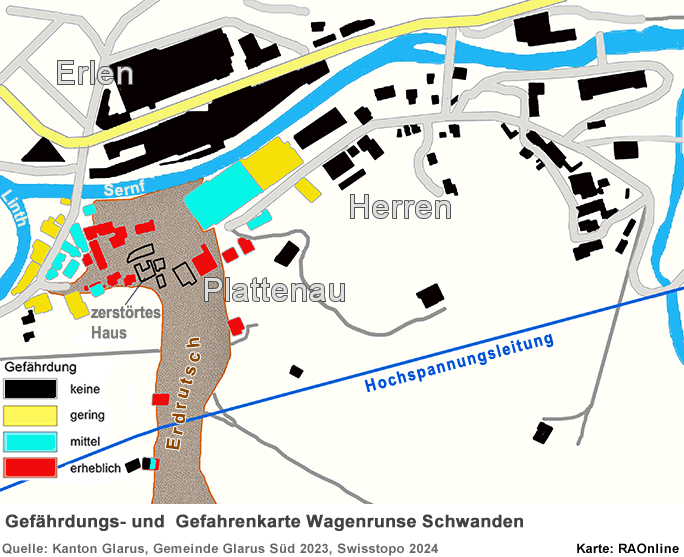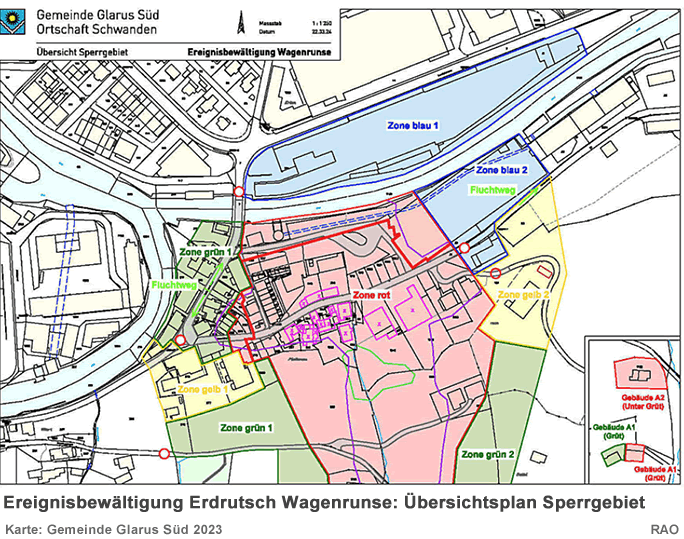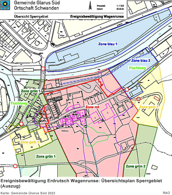 Planungszone Zusätzlich plant der Gemeinderat den Erlass einer Planungszone über die Gefahrengebiete der Wagenrunse. Eine Planungszone ist eine raumplanungsrechtliche Massnahme, welche verhindert, dass Widersprüche zur übergeordneten Planung entstehen können. Sie ist notwendig, weil ein Grossteil der Liegenscha!en gemäss rechtskräftigem Nutzungsplan einer Bauzone zugeordnet ist. Aufgrund der überarbeiteten Gefahrenkarte sind indessen Auszonungen oder Einschränkungen zu prü̈fen. Daher darf in einer Planungszone nichts unternommen werden, was die kommende Planung erschweren könnte. Insbesondere kann die Behandlung von Baugesuchen sistiert werden. Über den Erlass einer Planungszone wird der Gemeinderat Glarus Süd voraussichtlich am 25. Januar 2024 entscheiden und die entsprechenden Verfügungen Ende Januar 2024 versenden. Dann beginnt die Rechtsmittelfrist von 30 Tagen zu laufen. Die Rechtsmittelinstanz ist das Departement Bau und Umwelt (DBU). 23.12.2023,09.00 Uhr Situation der Rutschung am 23. Dezember 2023 Weitere Abbrüche Die von den Spezialisten erarbeiteten Szenarien, welche auch die Grundlage für die behördenverbindliche Gefahrenkarte sind, haben sich verwirklicht. In der Nacht kam es zu weiteren Abbrüchen von 1'000 bis 2'000 m3 an der Front und die Lockergesteinsmasse ist wieder in Bewegung. Der Murgang führte zu weiteren mässigen Schäden der Infrastruktur im betroffenen Quartier. Weitere Abbrüche an der Front sind wahrscheinlich. Das Abrutschen grösserer Mengen kann, Stand jetzt, nicht ausgeschlossen werden. Es ist möglich, dass die Beschleunigung der Lockergesteinsmasse sich verlangsamt oder aber weiter zunimmt. Derzeit kann ebenfalls nicht ausgeschlossen werden, dass zusätzliche Gebäude im Quartier Herren / Plattenau beschädigt werden. 09.01.2024,08.00 Uhr Situation der Rutschung am 9. Januar 2024 Rutschung Wagenrunse - erneute Abbrüche bis ins Wohngebiet! Abbrüche bis ins Siedlungsgebiet sind weiterhin möglich Durch die Ereignisse vom 22/23 Dezember und den Tagen bis zum 3. Januar 2024 sind ein weiteres Mal ca. 15'000 m3 Material losgebrochen und als Murgang bis ins Siedlungsgebiet vorgedrungen. Dabei wurden erneut Gebäude beschädigt. Erheblich zu den erneuten Gebäudeschäden beigetragen haben auch ca. 150 m3 Wasser, welche sich kurzfristig aufgestaut haben. In der Nacht vom 23. zum 24. Dezember 2023 kam es zu einem Dammbruch, der dazu fü̈hrte, dass sich das angestaute Wasser schlagartig in die Rinne unterhalb der Rutschung und bis ins Siedlungsgebiet entleerte. Das Ausmass der Gebäudeschäden, welche durch die neuesten Ereignisse entstanden sind, kann noch nicht abschliessend beurteilt werden. Räumungsarbeiten haben begonnen. Trotz der Feiertage konnten nötige, temporäre Ablagerungsflächen geschaffen und Unternehmer mit geeigneten Gerätschaften organisiert werden. Deshalb kann schon heute, am 9. Januar 2024, mit Räumungsarbeiten auf der Plattenaustrasse bis zum Gebäude Herrenstrasse 1 begonnen werden. Bereits in Prü̈fung durch die Gemeinde und die kantonale Hauptabteilung Militär und Zivilschutz ist der Einsatz vom Zivilschutz fü̈r die Räumung innerhalb der Gebäude, welche von den neuesten Murgängen betroffen sind. Leider können aus verschiedenen Gründen die Räumungsarbeiten in der roten Evakuationszone (Gemäss Sperrzonen Plan der Gemeinde) noch nicht durchgefü̈hrt werden. Zutritt während Räumungsarbeiten nicht möglich Während den maschinellen Räumungsarbeiten dü̈rfen die betroffenen Gebiete aus Sicherheitsgründen nicht betreten werden. Die neu beschädigten Gebäude müssen vor dem Betreten auch wieder durch einen Statiker geprü̈ft werden. Liegenschaften in den Gefahrengebieten Gelb und Grün Sobald es der Arbeitsfortschritt der Räumung und die Sicherheit zulassen, werden die Eigentümer der Liegenschaften im gelben und grü̈nen Gefahrengebiet kontaktiert, so dass sie gemeinsam mit 18.01.2024,14.30 Uhr Situation der Rutschung am 18. Januar 2024 Rutschung Wagenrunse - erneute Abbrüche bis ins Wohngebiet! In der Nacht vom 17. auf den 18. Januar 2024 kam es im Gebiet der Rutschung erneut zu Abbrü̈chen, die bis ins Siedlungsgebiet gelangten. Die Situation bleibt sehr gefährlich. Die Abbrü̈che in der Nacht vom 17. auf den 18. Januar 2024 erfolgten aus der sehr grossen Lockergesteinsrutschung trotz nur geringen Niederschlägen. Rund 1'000 m3 Runsenmaterial gelangten als Murgang bis ins Siedlungsgebiet. Das Material erreichte Gebiete, in welchen in den letzten Tagen Räumungsarbeiten erfolgten. 09.04.2024,09.30 Uhr Situation der Rutschung am 9. April 2024 Räumungsstart im Erdrutschgebiet in Schwanden: Erdrutschmasse wird abtransportiert Seit Montag, 8. April 2024, fahren im Erdrutschgebiet in Schwanden erneut leistungsstarke Maschinen auf. Diese werden die grosse Rutschmasse aus dem Gebiet Plattenau abtransportieren und fachgerecht in den dafür bereitgestellten Ablagerungsflächen einbauen. Gleichzeitig starten die Arbeiten für die geplanten Schutzbauten. Die Schweizer Armee hat ihren Einsatz mit dem ferngesteuerten Raupenbagger erfolgreich beendet. Gestern sind im Erdrutschgebiet in Schwanden die ersten leistungsstarken Räumungsmaschinen eingetroffen. Nach den gesetzlich verlangten Ausschreibeverfahren kann nun der beauftragte Unternehmer mit den Räumungsarbeiten der Erdrutschmasse beginnen. Seine Aufgabe wird es sein, die grosse Rutschmasse abzutransportieren und fachgerecht in den neu erstellten Ablagerungsflächen einzubauen. Ablagerungsflächen für die Erdrutschmasse Seit dem Spätherbst wurden östlich der grossen Rutschmasse zwischen Linth und Sernf im Gebiet Herren Ablagerungsplätze für die ca. 35'000 Kubikmeter Erdrutsch-Material geschaffen. Das Finden und Schaffen von Ablagerungsflächen für diese Mengen von nicht verwertbarem Material war eine der vielen Herausforderungen für die Gemeinde Glarus Süd bei der Bewältigung des Naturereignisses Rutschung Wagenrunse. Beim Ausheben der Ablageru