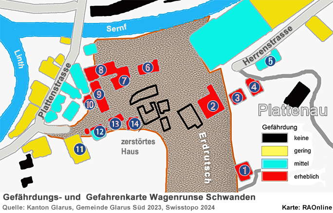 Gefahrengebiet Rot Das Gefahrengebiet Rot weist aufgrund der ereignisbezogenen Gefahrenkarte und des darauf fussenden Risikoberichtes eine sehr hohe Gefährdung aus. In diesem Gebiet herrscht unmittelbare Gefahr für Leib und Leben. Juristisch ausgedrückt, übersteigt das individuelle Todesfallrisiko in diesem Gebiet den gesellscha!lich akzeptierten Grenzwert zum Teil massiv. Der Gemeinderat ist deshalb zur Handlung verpflichtet. In einem Grundsatzentscheid hat der Gemeinderat festgelegt, für das Gefahrengebiet Rot dauerha!e Nutzungs- und Betretungsverbote mit Abbruchverfügungen zu erlassen. Das heisst, dass Gebäude in diesem Gebiet - Stand heute - abgebrochen werden müssen. Selbstverständlich ist die Umsetzung dieses Entscheides an rechtliche Vorgaben gebunden. Dazu gehört insbesondere, dass die betroffenen Grundeigentü̈mer vor dem Erlass der entsprechenden Verfügungen von einer Delegation des Gemeinderats angehört werden. Die betroffenen Personen werden noch im Dezember 2023 telefonisch informiert und zu Gesprächen eingeladen. Diese Gespräche sind für Mitte Januar 2024 geplant. Im Anschluss daran wird der Gemeinderat über die definitiven Verfügungen in Sachen Nutzungs- und Betretungsverbote mit Abbruchverfügungen entscheiden. Der Versand der Verfügungen wird Ende Januar 2024 erfolgen. Anschliessend beginnt die Rechtsmittelfrist von 30 Tagen zu laufen. Sperrzonen Die ereignisbezogene Gefahrenkarte des Kantons Glarus ist nicht in allen Teilen kongruent mit der Sperrzonenkarte der Gemeinde Glarus Süd. Das hängt damit zusammen, dass für die Berechtigung oder das Verbot die Sperrzonen zu betreten, zahlreiche Naturgefahrenkriterien berücksichtigt werden müssen, die in der Gefahrenkarte nicht abgebildet werden können.Die zeitlichen Horizonte für eine Rückkehr in die verschiedenen Sperrzonen ist von verschiedenen Faktoren abhängig, zeichnen sich Stand heute aber wie folgt ab: Sperrzone grün, Teil unterhalb der Plattenaustrasse in ca. 5 bis 6 Monaten Sperrzone grün, Teil oberhalb der Plattenaustrasse in ca. 7 bis 8 Monaten Sperrzone rot am Rand in Richtung Elm und in Richtung Lintahl in ca. 1 Jahr.