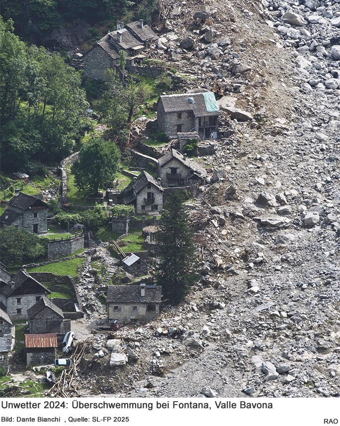 Ende Juni 2024 gingen über Teilen des Valle Bavona schwere Unwetter nieder. Besonders der Bach Larecchia im Bereich Fontana-Mondada-Bosco führte der Hochwasser und schob über 300‘000 Kubikmeter Geröll ins Tal. Menschen starben, Häuser wurden auseinandergerissen, und seither bedecken teils gigantische Felsblöcke landwirtschaftliche Flächen und Teile der traditionell gepflegten Kulturlandschaft.