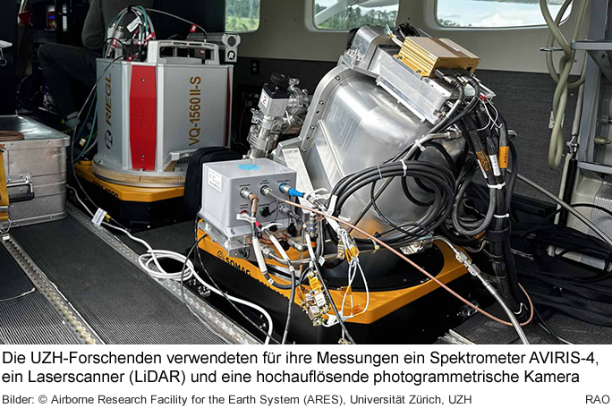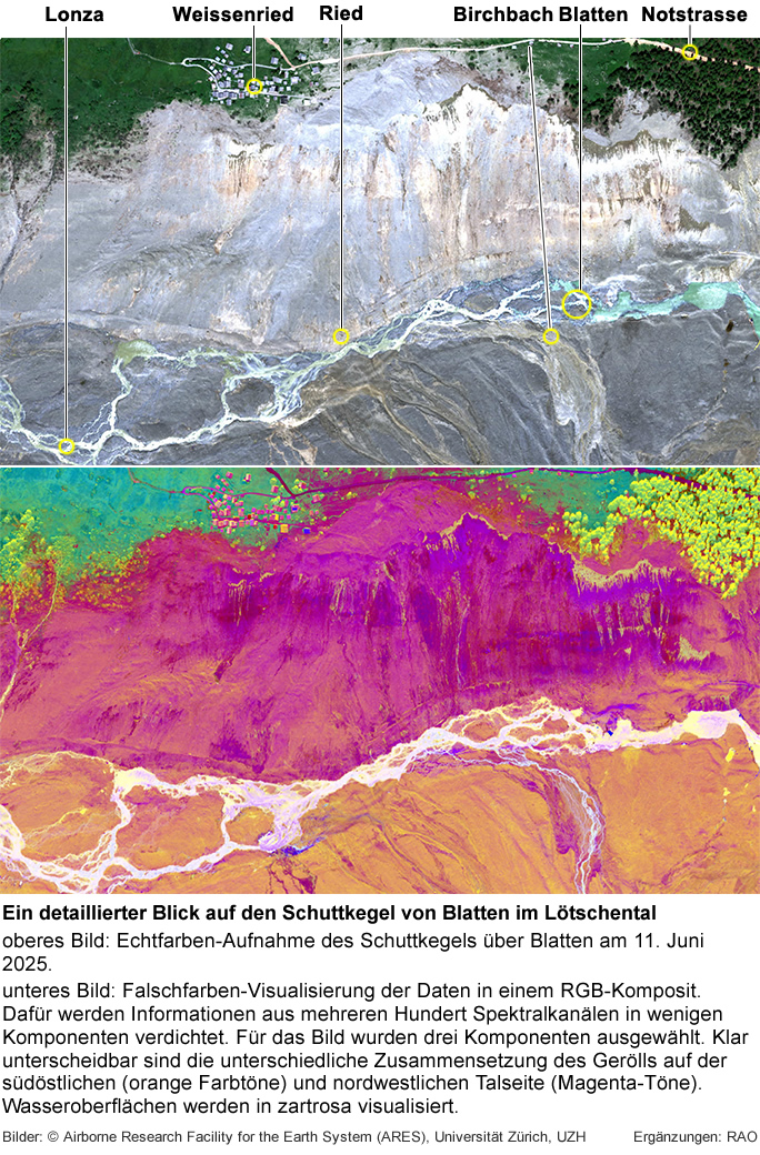 Die Bilder vom Bergsturzgebiet und dem gigantischen Schuttkegel in Blatten sind inzwischen weltweit bekannt. Nur kurz nach dem Bergsturz haben Fernerkundungsspezialisten der UZH vergangene Woche mit verschiedenen Sensoren das Bergsturzgebiet überflogen und Hyperspektraldaten im bisher umfassendsten Bandbreitenbereich von der Abriss-Stelle und dem Schuttkegel gesammelt. «Diese Daten können viel detaillierter als die bisher bekannten Fotografien Auskunft über die Beschaffenheit des Schuttkegels geben», sagt Mathias Kneubühler, wissenschaftlicher Abteilungsleiter des Fachbereichs Remote Sensing Spectroscopy (RSS) am Geographischen Institut der Universität Zürich. Forschende der Geologie, Glaziologe oder etwa Ökologie können sich damit nun ein möglichst klares Bild über die Situation in Blatten und die mögliche zukünftige Entwicklung verschaffen. Die Aufnahmen machten Andreas Hüni und Marius Vögtli von der Airborne Research Facility for the Earth System (ARES) der UZH am Mittwoch der vergangenen Woche aus der Luft in einem Flugzeug der Swiss Flight Services SA. Sie verwendeten dazu drei verschiedene Messgeräte: das Spektrometer AVIRIS-4, ein Laserscanner (LiDAR = Light detection and ranging) ) und eine hochauflösende photogrammetrische Kamera.
