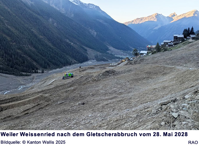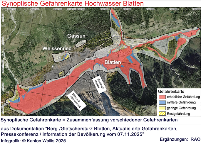 Der Bergsturz vom 28. Mai 2025 hat die Situation in Bezug auf die Naturgefahren im Siedlungsgebiet der Gemeinde Blatten und insbesondere beim ehemaligen Dorfkern und am Ried grundlegend verändert. Neue Ablagerungen sind entstanden, bestehende Hänge wurden instabil und zusätzliche Gefahrenherde haben sich gebildet. Mit den veränderten Fliesswegen und blockierten Wasserläufen ergeben sich neue Risiken durch Überschwemmungen und Murgänge. Auch die Lawinen- und Gletschergefahr hat sich verändert. Gebiete, die bisher als weniger gefährdet galten, sind heute deutlich stärker exponiert. In den umliegenden Weilern Eisten und Weissenried, hat sich die Gefahrensituation jedoch nicht oder nur wenig verändert.