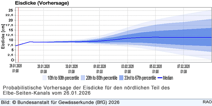 Aufgrund der anhaltend frostigen Temperaturen im Januar 2026 setzte die Wasserstrassen- und Schifffahrtsverwaltung des Bundes (WSV) auf dem Mittellandkanal, dem Elbe-Havel-Kanal und weiteren Bundeswasserstrassen, wie der Elbe und Oder, Eisbrecher ein. In den kommenden Tagen könnten sich die Eisvorkommen weiter ausdehnen. Die BfG unterstützt die WSV mit Eisvorhersagen für deren Eismeldedienst und die vorausschauende Eisbekämpfung.