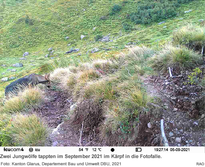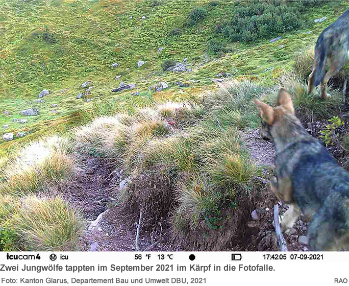 Während der vergangenen Tage wurden im eidgenössischen Jagdbanngebiet Kärpf zwei Jungwölfe gleichzeitig von einer Fotofalle fotografiert. Damit ist die vermutete Gründung eines weiteren Wolfsrudels im Kanton Glarus bestätigt. Die Anzahl Wolfswelpen ist unbekannt, Tonaufnahmen des Wolfsgeheuls weisen nach Experteneinschätzung auf mindestens vier Jungtiere hin.