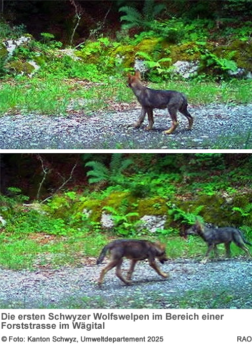 Am 22. Juli 2025 informierte der Kanton Schwyz, dass zwei Wolfswelpen nachgewiesen wurden und somit erstmals ein Wolfsrudel im Kanton Schwyz besteht. Am Donnerstag, 24. Juli 2025, gingen weitere wichtige Hinweise aus der Bevölkerung beim Amt für Wald und Natur ein: Eine Fotofalle hatte fünf Wolfswelpen aufgenommen. Diese Beobachtung konnte als wahrheitsgetreu bestätigt werden.