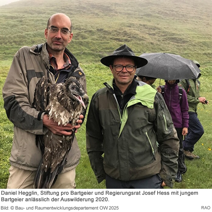 Der Regierungsrat des Kantons Obwalden bewilligte am 25. November 2025 die Auswilderung von Bartgeiern auf der Melchsee-Frutt für weitere fünf Jahre. Seit 2015 wurden dort bereits 18 Jungvögel ausgewildert. Der Standort hat sich dank der guten Erschliessung und starken regionalen Zusammenarbeit bewährt. Die Fortsetzung des Projekts stärkt die genetische Vielfalt des Bartgeiers und unterstützt seine Rückkehr in den Alpenraum.