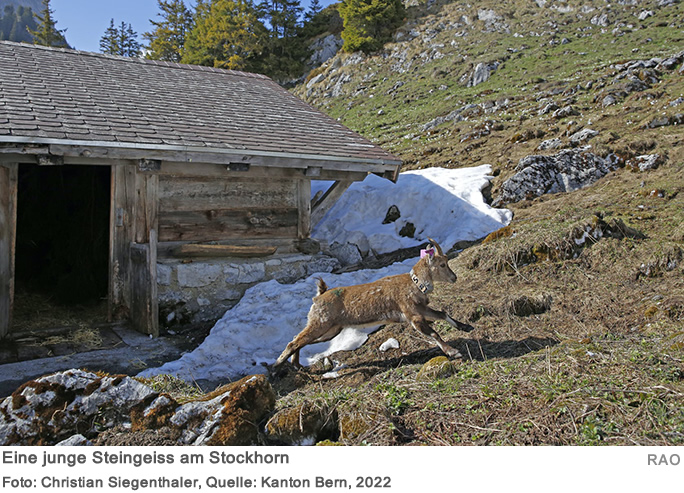 Im Frühling 2022 wurden am Stockhorn (Niedersimmental, Kanton Bern, 2'190 m ü.M.) die ersten Steinböcke und -geissen ausgesetzt. Die Verantwortlichen beim Kanton erhoffen sich mehr Artenvielfalt in der Region und eine bessere genetische Basis des Steinwilds im Kanton Bern. Und die Initianten des Projekts vom Verein Freunde des Stockhorns freuen sich über die attraktiven neuen Bergbewohner.