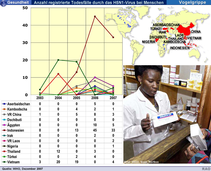 Stichworte: Ägypten, Aserbaidschan, Ausbreitung, China, Dschibuti, H5N1-Virus, Indonesien, Irak, Kambodscha, Laos, Nigeria, Thailand, Todefall, Türkei, Vietnam, Vogelgrippe