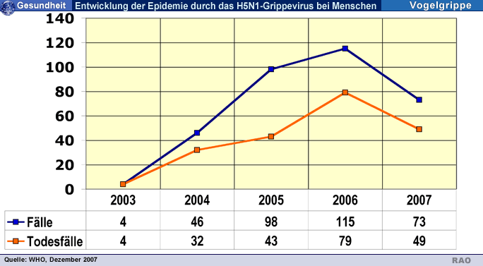 Stichworte: Ägypten, Aserbaidschan, Ausbreitung, China, Dschibuti, H5N1-Virus, Indonesien, Irak, Kambodscha, Laos, Nigeria, Thailand, Todefall, Türkei, Vietnam, Vogelgrippe