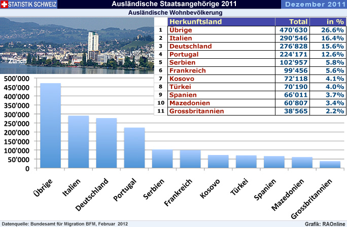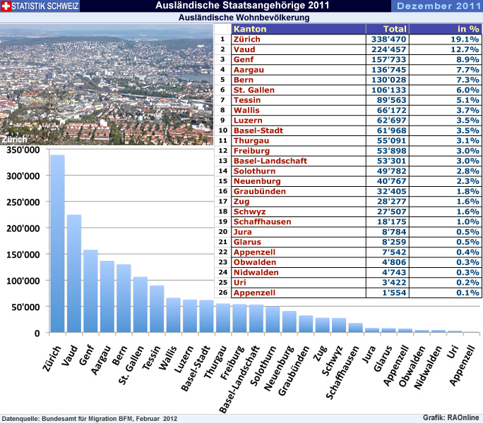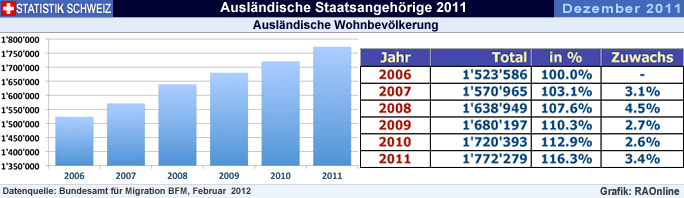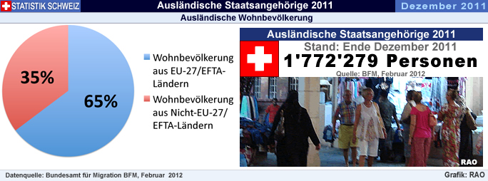 Ende Dezember 2011 lebten insgesamt 1'772'279 Ausländerinnen und Ausländer in der Schweiz. Die meisten von ihnen (1'147'185) stammen aus den EU-27/EFTA-Staaten. Ihr Bestand stieg 2011 mit 4,1 Prozent leicht stärker an als im Vorjahr (2010: 3,3 Prozent). Nach Auffassung des Bundesamtes für Migration zeigt dies, dass sich die Bestandszunahme bei diesen Personen der jeweils wirtschaftlichen Situation in der Schweiz angleicht.