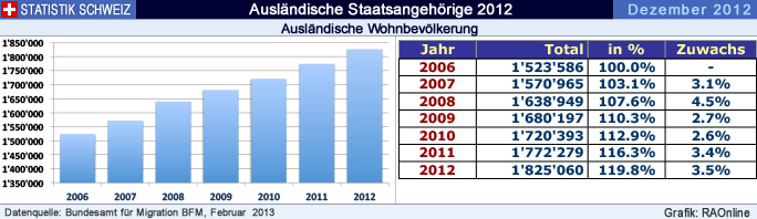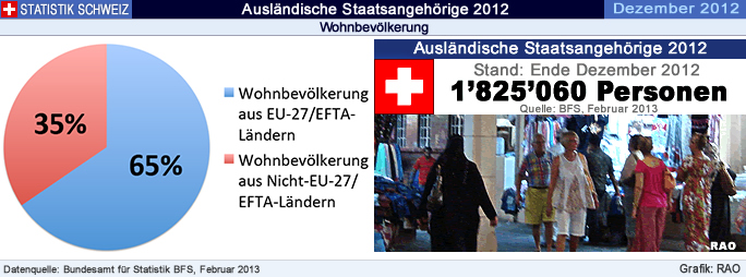 Ende Dezember 2012 lebten insgesamt 1 825 060 Ausländerinnen und Ausländer in der Schweiz. Dies entspricht einer Zunahme von 52 781 Personen (+3 %). Die meisten von ihnen stammen aus den EU-27/EFTA-Staaten (1 194 640). Ihr Bestand stieg 2012 mit 4,1 % analog zum Vorjahr (2011: +4,1 %). Um 0,9 % zugenommen hat der Bestand an Personen aus den Drittstaaten (+5326).