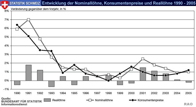 1993 und 2005 wuchsen die Nominallöhne über die gesamte Wirtschaft