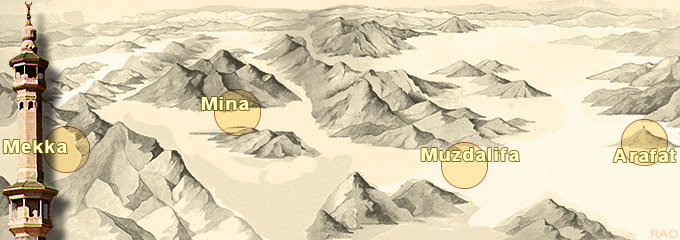 von Mekka, Mina, Muzdalifa, und Arafat.