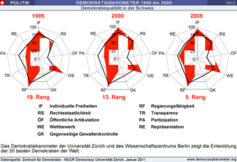 Die Schweiz erweist sich zwar hinsichtlich der Erfüllung individueller Freiheiten, aktiver Öffentlichkeit, Wettbewerb und Regierungsfähigkeit als ein demokratisches Musterland. Gewaltenkontrolle, Transparenz und Partizipation werden aber nur sehr schlecht umgesetzt: In der Schweiz kann die Legislative die Regierung nur sehr unzureichend kontrollieren, die Judikative ist im Vergleich mit anderen Demokratien nicht sehr unabhängig, es gibt keine transparente Parteienfinanzierung und - bis 2005 -keine wirksame gesetzliche Garantie der Informationsfreiheit.