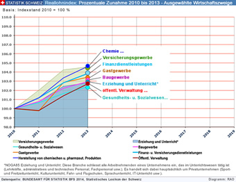 Für die Gesamtheit der Wirtschaftsbranchen stiegen die Reallöhne 2013 um 1,0 Prozent. Diese Zunahme ist auf die Nominallohnerhöhung von 0,7 Prozent und eine negative Teuerung von -0,2 Prozent zurückzuführen.