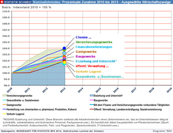 Der sekundäre Sektor verbuchte im Jahr 2013 eine Lohnwachstumsrate von 0,7 Prozent. Analog zum tertiären Sektor sind die Lohnerhöhungen auch im Industriesektor sehr unterschiedlich ausgefallen. Die höchsten Nominallohnerhöhungen wiesen drei Exportbranchen auf, namentlich die Branchen «Maschinenbau» (+1,6%), «chemische und pharmazeutische Industrie» (+1,0%) und «Herstellung von Datenverarbeitungsgeräten, elektronischen und optischen Erzeugnissen, Uhren, elektrischen Ausrüstungen» (+1,0%). In den Branchen «Bergbau und Gewinnung von Steinen und Erden, Energie- und Wasserversorgung, Abfallentsorgung» und «Herstellung von Nahrungsmitteln und Getränken; Tabakverarbeitung» (beide 0,0%) blieben die Nominallöhne unverändert.