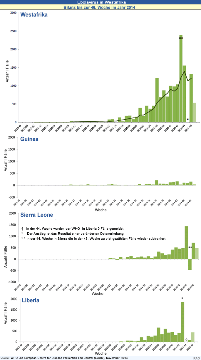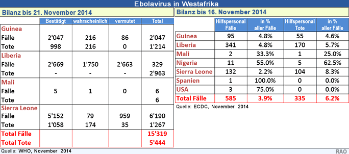 Seit dem Ausbruch der Ebola-Seuche sind bis Mitte November 2014 ingesamt 15'351 Infektionsfälle in 8 Ländern mit 5'459 Toten gemeldet worden. Die Übertragungsrate der Ebola-Viren ist in Guinea, Liberia und Sierra Leone weiterhin hoch. Neu hat die Seuche auch auf Mali übergegriffen. In Nigeria und Senegal gibt es noch wenige Verdachtsfälle. 585 oder rund 4% der registrierten Fälle mit 335 Toten (rund 6%) betrafen Menschen aus dem Hilfspersonal.