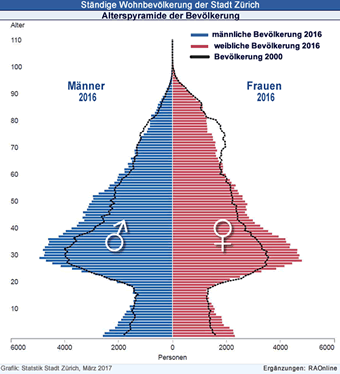 Ende 2016 wohnten 415 682 Personen in der Stadt Zürich. Das sind 54 702 Personen mehr als im Jahr 2000. Die Altersgruppe der Personen von 30 bis 39 Jahren ist in diesem Zeitraum um 22 Prozent gewachsen. |