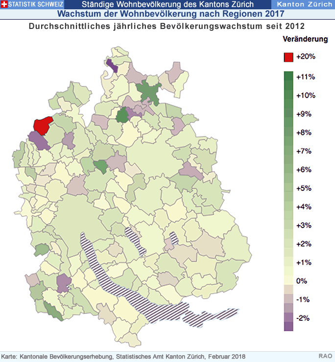 Auf der anderen Seite sind 36 der 168 Zürcher Gemeinden geschrumpft, und zwei Gemeinden hatten exakt gleich viele Einwohnerinnen und Einwohner wie im Vorjahr.