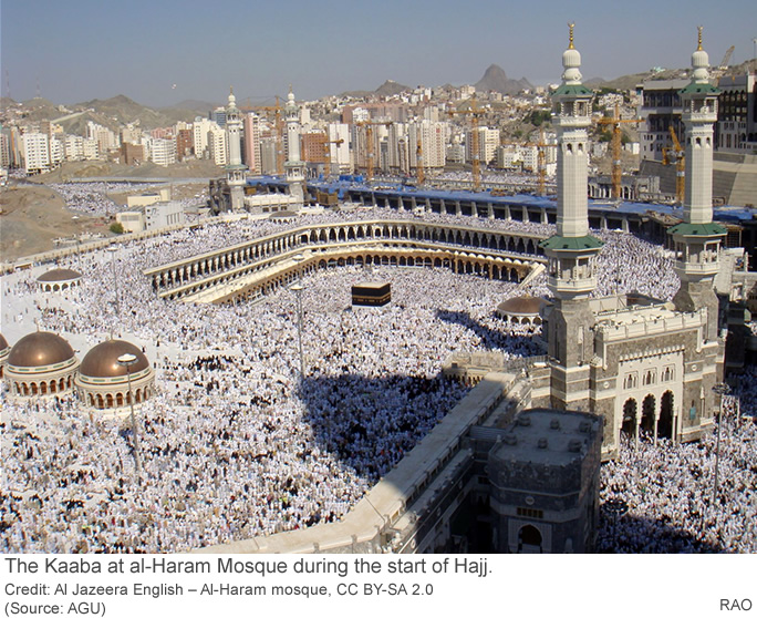 Over two million Muslim travelers just finished the annual religious pilgrimage to Mecca, Saudi Arabia, traveling during some of the country's hottest weather. New research finds pilgrims in future summers may have to endure heat and humidity extreme enough to endanger their health. The results can help inform policies that would make the trip safer for the several million people who make the pilgrimage each year, according to the study's authors. Hajj, or Muslim Pilgrimage, is one of the five pillars of the Muslim faith. It is an annual pilgrimage to Mecca, Saudi Arabia, that involves living in the hot weather conditions of Saudi Arabia. Muslims are expected to make the pilgrimage at least once in their lifetimes. Islam follows a lunar calendar, so the dates for Hajj change every year. But for five to seven years at a time, the trip falls over summer. A new study projecting future summer temperatures in the region around Mecca finds that as soon as 2020, summer days in Saudi Arabia could surpass the United States National Weather Service's extreme danger heat-stress threshold, at a wet-bulb temperature of 29.1 degrees C (84.3 degrees Fahrenheit). Wet-bulb temperature is a measurement combining temperature with the amount of moisture in the air. At the extreme danger threshold defined by the National Weather Service, sweat no longer evaporates efficiently, so the human body cannot cool itself and overheats. Exposure to these conditions for long periods of time, such as during Hajj, could cause heat stroke and possibly death. "When the Hajj happens in summer, you can imagine with climate change and increasing heat-stress levels conditions could be unfavorable for outdoor activity," said Elfatih Eltahir, a civil and environmental engineer at Massachusetts Institute of Technology and co-author of the new study in the AGU journal Geophysical Research Letters. "Hajj may be the largest religious tourism event," Eltahir said. "We are trying to bring in the perspective of what climate change could do to such large-scale outdoor activity."
