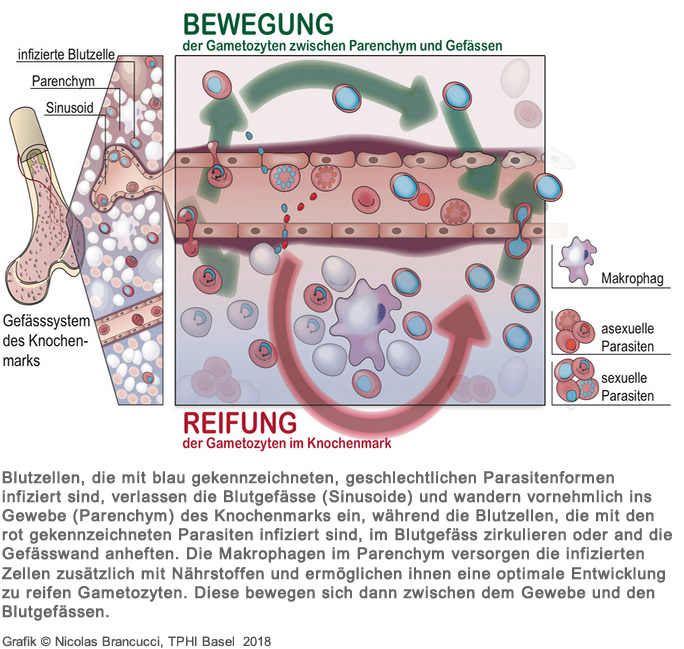 Die Arbeitsgruppen in Bern und Glasgow haben nun herausgefunden, dass die Parasiten, die später zu Gametozyten heranreifen, zu einem sehr frühen Zeitpunkt ins Knochenmark des Wirtes einwandern, wo sie von einem optimalen Nährstoffangebot profitieren können. Es wurde schon länger vermutet, dass die Gametozyten im Knochenmark heranreifen, weil man in Biopsien verstorbener Patientinnen und Patienten geschlechtliche Formen im Knochenmark gefunden hatte.