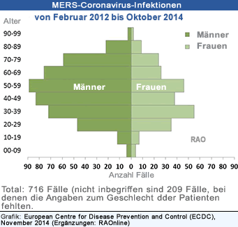 | Nach Angaben des ECDC haben die Gesundheitsbehörden der betroffenen Länder bis am 5. November 2014 weltweit 929 Fälle von Laboren bestätigte MERS-CoV-Infektionen an die Weltgesundheitsorganisation WHO gemeldet. 372 dieser Infektionen führten zum Tod der Patienten. Die meisten Fälle wurden aus dem Nahen Osten gemeldet.
