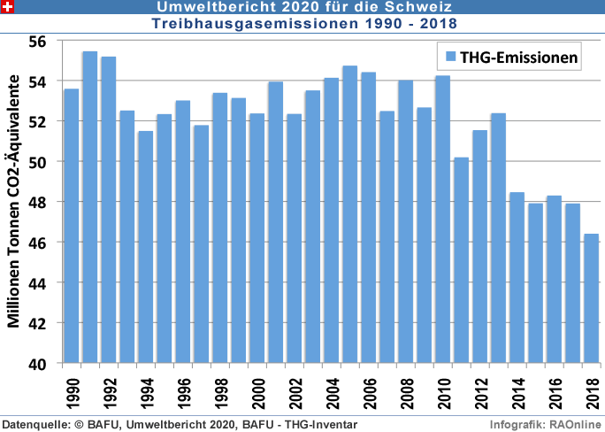 Die Treibhausgasemissionen beliefen sich im Jahr 2017 in der Schweiz auf 47,2 Millionen Tonnen CO2-Äquivalente, 1 Million Tonnen weniger als 2016.
