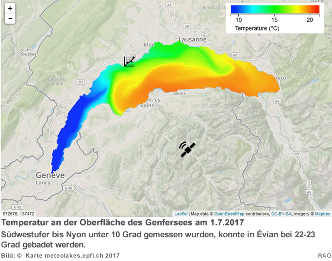Temperatur an der Oberfläche des Genfersees am 1.7.2017: Während in Genf und am Südwestufer bis Nyon unter 10 Grad gemessen wurden, konnte in Évian bei 22-23 Grad gebadet werden.