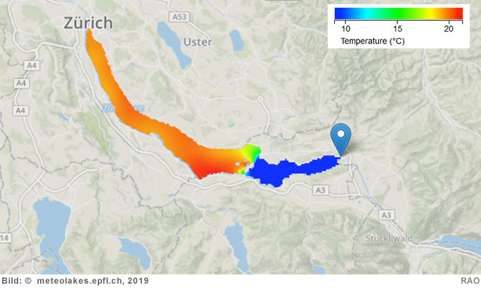 Auf www.meteolakes.ch haben Forschende von Eawag und EPFL vor zwei Jahren ein öffentlich zugängliches 3D-Modell aufgeschaltet, das aktuelle und prognostizierte Daten von MeteoSchweiz, hydrologische Daten des Bundesamtes für Umwelt und Satellitendaten nutzt, um Seewassertemperaturen darzustellen. Die Temperaturen werden für verschiedene Tiefen und mit einer zeitlichen Auflösung von drei Stunden berechnet. Die Seemodelle können fünf Tage in die Zukunft blicken. Bisher existierten Modelle für den Genfersee, den Bieler- und den Greifensee. Diese Woche kam der Zürichsee dazu.