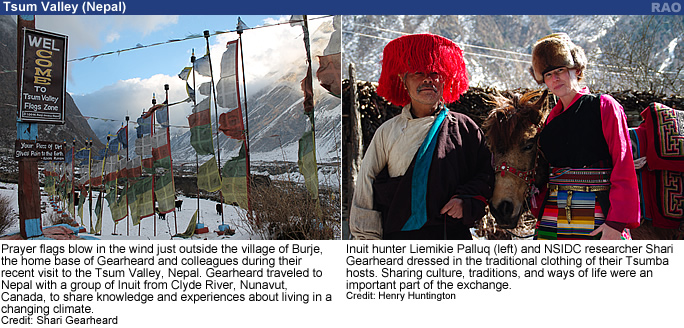 From February 3 to 17, 2012 ,NSIDC scientist Shari Gearheard traveled to Nepal with a group of Inuit from Clyde River, Nunavut, Canada. The team exchanged knowledge and ideas with Nepalese and Tsumbas, residents of the Tsum Valley, a high alpine region experiencing rapid environmental change, much like the Arctic. Gearheard said, "Communities in both these regions depend upon snow and ice and that snow and ice is changing."