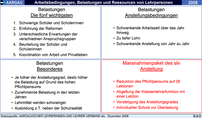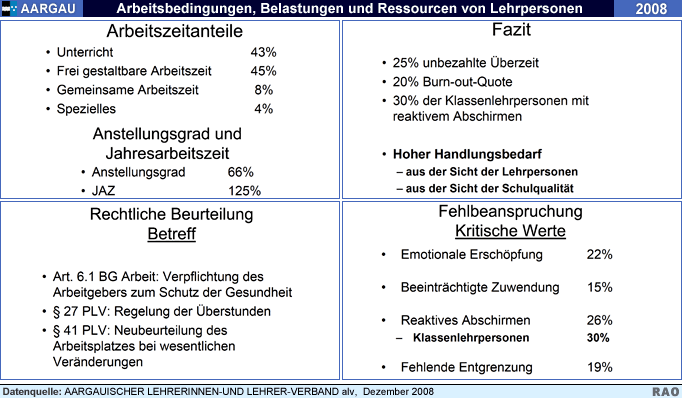 Die Personalprobleme, die die aargauische Schule heute schon hat, dürften sich massiv verschärfen. Der aargauische Lehrerinnen-und Lehrer-Verband empfiehlt deshalb dringend eine Verbesserung der Arbeitsbedingungen an der Schule. Insbesondere sind folgende Massnahmen zu ergreifen: Der Berufsauftrag und die zur Verfügung stehende Zeit müssen in Einklang gebracht werden. Denn eine andauernde zeitliche überbeanspruchung in diesem Ausmass ist nicht zu akzeptieren, sie verstösst auch gegen den gesetzlich vorgeschriebenen Gesundheitsschutz. Die Anstellungsbedingungen müssen im Vergleich zu anderen Kantonen und anderen Fachhochschulberufen konkurrenzfähig gemacht werden. Der Prävention gegen Burn-out ist Rechnung zu tragen durch bessere Abläufe in der Schule, bessere Erholungsmöglichkeiten und individuelle Schutzmassnahmen gegen überbelastung. Der Präsident des alv Niklaus Stöckli