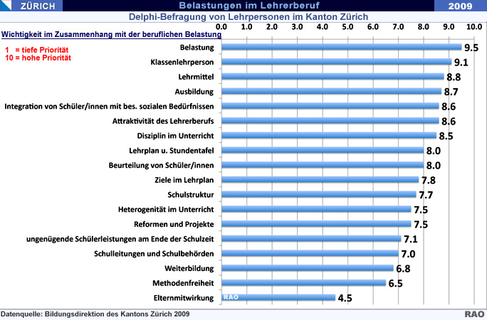 Die interviewten Lehrpersonen mussten zuerst 18 Diskussionsthemen in einer Prioritätenliste ordnen und anschliessend Lösungsvorschläge zu den Themen entwickeln. Das Institut für Bildungsevaluation an der Universität Zürich hat nun die Ergebnisse dieserDelphi-Befragung ausgewertet und dazu einen Bericht verfasst. Bei einer Delphi-Befragung handelt es sich um eine wissenschaftlich anerkannte Form einer schriftlichen Befragung. Es fanden drei anonyme und geheime Interviewrunden mit den Beteiligten statt. In einer vierten Runde wurde in einer Gruppendiskussion nach konsensfähigen Lösungen gesucht. |