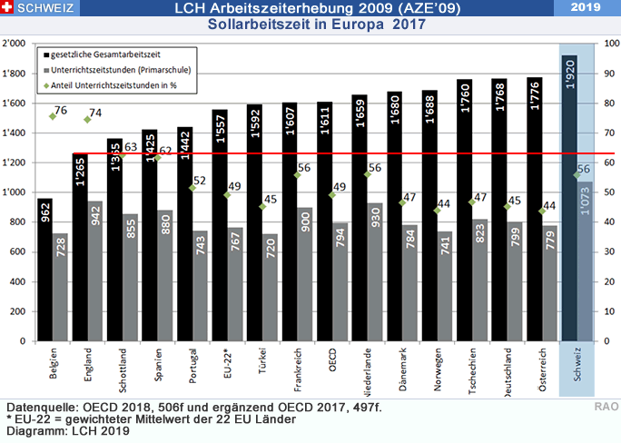 Die Vorurteile über die Arbeitszeit von Lehrpersonen hängen stark mit dem Berufsbild und den eigenen Erfahrungen aus der oft weit zurück liegenden Schulzeit zusammen. Da mit dem Unterricht nur ein Teil der gesamten Arbeitszeit von Lehrpersonen sichtbar ist, sind Klischeevorstellungen wie die Mär von zwölf Wochen Ferien nur schwer zu ändern. Über den Witz „Lehrer haben vormittags recht und nachmittags frei“ kann man heute aber nicht mehr lachen angesichts der zunehmenden Belastungen in diesem Beruf. Durch die ständige Delegation von Erziehungsaufgaben an die Schule und eine Vielzahl von Reformen und Ansprüchen der Lernenden und Eltern geraten immer mehr Lehrpersonen in eine Überbelastung, die auf Dauer gesundheitsschädigend ist. Aus all diesen Gründen hat der LCH bereits 1999 und 2009 wissenschaftliche Arbeitszeiterhebungen in Auftrag gegeben, um verlässliche Zahlen zu bekommen. 2019 haben so viele Lehrpersonen an der Arbeitszeiterhebung teilgenommen wie noch nie. Erstmals konnte die AZE auch in der Romandie durchgeführt werden. Damit ist die AZE'19 / ETT'19 die grösste je durchgeführte Arbeitszeiterhebung für Lehrpersonen in der Schweiz. AZE 1999: Lehrpersonen erfüllen die Sollarbeitszeiten im öffentlichen Dienst Mit der Arbeitszeitstudie des LCH von 1999 konnte erstmals in der Schweiz die Äquivalenz der Jahresarbeitszeit von Lehrpersonen mit den Sollarbeitszeiten von Angestellten im öffentlichen Dienst empirisch nachgewiesen werden. Die Werte lagen je nach Schulstufe im Bereich zwischen rund 1900 und knapp 2000 Stunden. Der ungesunde Rhythmus der Lehrerarbeit im Wochen-und im Jahresverlauf wurde ebenso erkannt wie die ungleiche Verteilung der Zusatzarbeiten im Kollegium. Seit der AZE von 1999 wurden weitere (meist kantonale) Studien durchgeführt, die gleiche oder noch höhere Jahresarbeitszeiten ergaben und damit indirekt zur Akzeptanz der mit Abstand aufwändigsten AZE des LCH in der Schweiz führten. AZE 2009: Lehrpersonen leisten Gratisarbeit im Wert von 900 Millionen 2009 stieg der Anteil der Teilzeitlehrpersonen auf 62% und parallel dazu stieg die Anzahl geleisteter Über.stunden weiter an. Wir haben damals vor 10 Jahren den Gegenwert der real geleisteten Überstunden aller Lehrpersonen in der Schweiz berechnet und sind auf über 900 Millionen Franken pro Jahr gekommen. Diese unbezahlte Gratisarbeit ist nicht nur aus Arbeitnehmersicht inakzeptabel, sondern auch deshalb, weildiese vielen Überstunden letztlich zu einem Burnout führen. Der LCH und der SER haben daher in den letzten 10 Jahren das Thema Burnout-Prävention und Abbau von unbezahlter Überzeit immer wieder aufgegriffen und die Lehrpersonen dazu aufgerufen, weniger zu arbeiten und dafür mehr für die Erhaltung der Gesundheit zu tun. AZE 2019: Reduktion der unbezahlten Überstunden Heute haben wir den Lohn für unsere Bemühungen erhalten: Zwar ist die Summe der geleisteten Arbeitsstunden für ein Vollzeitäquivalent immer noch zu hoch, so dass Schweizer Lehrpersonen weiterhin Gratisarbeit im Umfang von Hunderten von Millionen Franken pro Jahr leisten; doch der Rückgang der unbezahltenÜberzeit um 40% ist erfreulich. Vollzeit-Lehrpersonen achten heute mehr auf eine gesundheitserhaltende Balance zwischen Arbeitszeit und Freizeit. Das liegt auch im Interesse der Arbeitgeber, denn wir brauchen in den kommenden 5 Jahren möglichst viele gesunde Lehrpersonen, weil die Schülerzahlen bis 2024 auf einen historischen Höchststand steigen und weil gleichzeitig überdurchschnittlich viele Lehrpersonen in Pen.sion gehen. Es ist daher wichtig, dass genügend neue Lehrpersonen an den Pädagogischen Hochschulen ausgebildet werden und der Anteil Teilzeitlehrpersonen nicht mehr weiter anwächst. Das geht aber nur, wenn man auch mit einem Vollzeitpensum über Jahre hinweg gesund bleiben kann in diesem Beruf. Schweizer Lehrpersonen haben die höchste Sollarbeitszeit in Europa Ein OECD-Vergleich zu den gesetzlich vorgeschriebenen Sollarbeitszeiten von Lehrpersonen in europäischen Ländern zeigt, dass die Schweiz mit 1'920 Stunden eine deutlich höhere Gesamtarbeitszeit für Lehrpersonen vorgibt als in allen anderen europäischen Ländern: