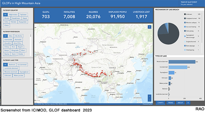 The Hindu Kush Himalayan (HKH) region is recognised as a "hotspot of risk" for hazards such as GLOFs. The GLOF dashboard captures a number of key datapoints about each flood: date, time, place, volume of water; triggers; physical characteristics of the lake dam; and the impact in lives, livelihoods, property and infrastructure.